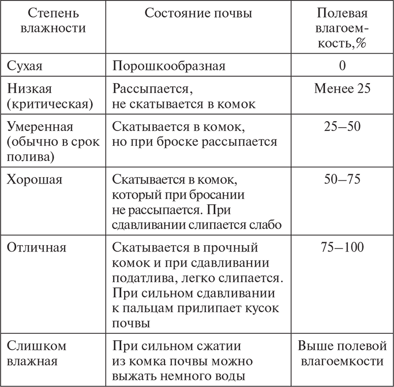 Существует специальная таблица для определения влажности почвы на ощупь (табл. 2). При этом на песчаных почвах скатанные комки более рыхлые и ломкие при любой степени влажности.
