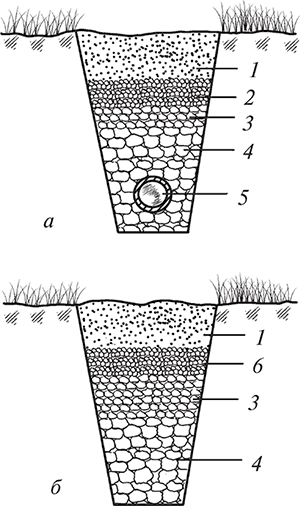 Рис. 1. Схема закладки дрен разной конструкции: а – дрена из труб; б – дрена из щебня; 1 – почва или песок; 2 – щебень или гравий; 3 – средний щебень (5–7 см); 4 – крупный гравий (7–10 см); 5 – дренажная труба; 6 – мелкий щебень
