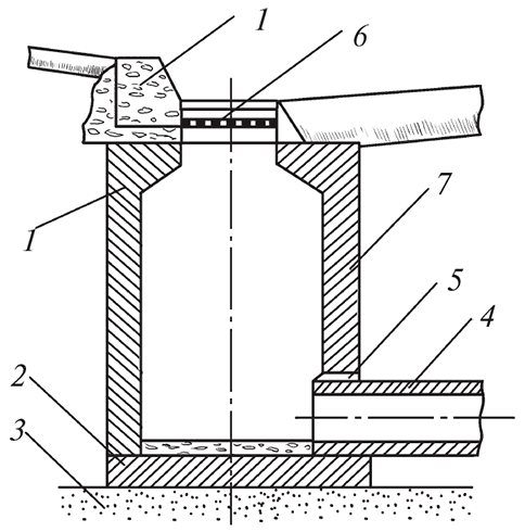 Рис. 2. Схема устройства дождеприемного колодца: 1 – стенки рабочей камеры; 2 – днище; 3 – песчаное основание; 4 – выход трубы из дождеприемного колодца; 5 – бетон, закрывающий отверстие; 6 – чугунная решетка; 7 – каменный бортик колодца