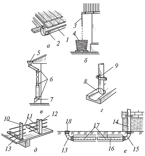 Рис. 3. Виды водостоков: а – крепление подкарнизного водосточного желоба; б – водосток с цепью; в – водосток с воронкой; г – водоотводящий желоб; д – снегоудержатели; е – водосток с подземной системой орошения; 1 – желоб; 2 – крюк; 3 – цепь; 4 – бочка; 5 – воронка; 6 – кронштейны крепления; 7 – водоотводящий патрубок; 8 – железобетонный желоб; 9 – упор; 10 – кронштейн из полосовой стали; 11 – проволочное ограждение; 12 – кронштейн из уголка; 13 – косынка; 14 – водосточный стояк; 15 – колено; 16 – асбоцементная труба с перфорацией диаметром 100–150 мм; 17— отверстия; 18 – вентиляционный оголовок с защитной сеткой