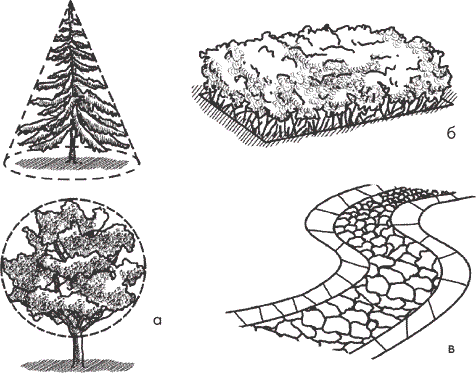 Природные элементы по своей форме приближаются к геометрической: например, деревья можно представить как шары, конусы и пр. Форма растительных объектов может быть линейной (одно измерение (длина) превалирует над двумя другими (высотой и шириной), предельно малыми), плоскостной (примерно равны два измерения (длина и ширина), при этом третье (высота) отличается малой величиной), объемной (все измерения (высота, длина и ширина) примерно равны по величине). Определяется это соотношением измерений (рис. 3).