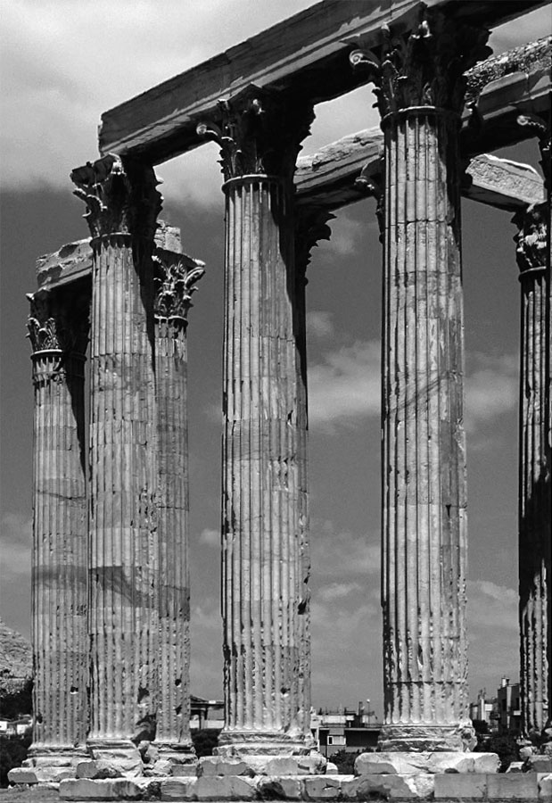 Что, например, нужно сделать, чтобы построить из дерева и сырцового кирпича храм какому-то греческому богу, скажем Зевсу? Прежде всего, поскольку стены из столь непрочного материала боятся и дождя, и солнца, желательно, чтобы глухие стены святилища окружала открытая галерея или навес, где удобно укрыться от солнца. Мы ставим ряд вертикальных столбов, найдя подходящие деревья (что, вообще-то, не просто на этом полуострове). Наш металлический инструмент, очищая их от коры, уже оставил характерные канавки вдоль всего ствола. Добавим, что вряд ли эти стволы правильной цилиндрической формы: чтобы опоры были устойчивыми или по крайней мере казались такими, желательно заузить их кверху. Однако необходимо и какое-то расширение на конце для поддержки несомых частей, поэтому каждый столб мы завершим подобием круглой чаши, на которой, в свою очередь, будет лежать квадратная плита. Теперь сверху можно положить несколько горизонтальных балок, установив их для большей жесткости на ребро.