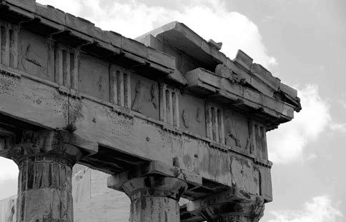 Деталь храма Афины Парфенос (Афины-девы). Хорошо видно устройство антаблемента. Непосредственно на колонны опираются балки архитрава, выше расположен фриз, составленный из метоп и триглифов. Над ними нависает карниз. Для лучшей сохранности метопы были заменены копиями. Подлинники хранятся здесь же, на Акрополе, в специальном музее.