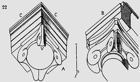 Обычно «проблема угловой ионической капители» решается так, как показано на рисунке. Иногда на 45° отгибаются только угловые волюты, иногда – все.