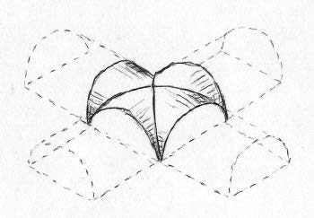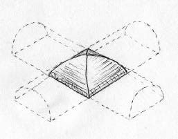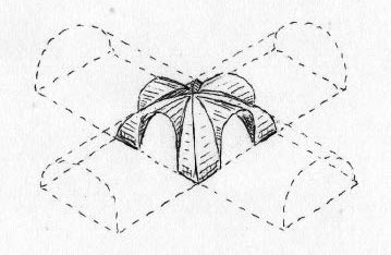 Представим себе, что мы вложили два коротких цилиндрических свода один в другой крест-накрест, так, чтобы они «прорезали» друг друга, образуя в плане квадрат. В результате мы получим восемь деталей: четыре – похожие на раздувшиеся с боков треугольники, поставленные вертикально, но с оттянутыми книзу верхушками; четыре – треугольники с вогнутыми краями, положенные горизонтально, но с загнутыми вниз, как у женской косынки, углами (словесные описания получаются сложными, но сами фигуры простые). Поскольку детали вырезаны из свода, они, несмотря на то что сложены из отдельных камней, могут работать как несущие конструкции, правда, не самостоятельно, а в составе общей системы.