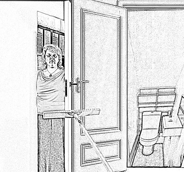 Ударившись об торец туалетной двери, дверь в офис отскочила и направилась в обратную сторону, почти закрыв щель, через которую Юля разглядывала хозяйку кабинета. Затем, так как её с силой ударили изнутри, дверь с грохотом и большой скоростью отскочила назад, ещё раз врезалась в торец туалетной двери, а тётка прыгнула своим тучным телом в этот проём. Дверь в кабинет, уперлась в дверь уборной, а бросившаяся наружу женщина подпёрла её, застряв в узком проёме, протиснув в небольшое отверстие, лишь левую руку с плечом.