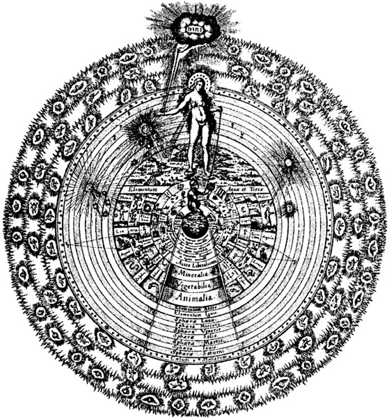 Однако еще более существенным является философское различие между этими направлениями. В классической парадигме считается, что социальная эволюция происходит исключительно посредством развития инструментов. История развития западной цивилизации – это история развития инструментов и технологий. Нетрадиционная парадигма дает альтернативное понимание социальной эволюции – развитие способностей самого человека. Человек является определяющим элементом и находится в фокусе всех процессов. На рис. 1 показана иллюстрация этой гомоцентричной парадигмы, как ее представляли себе последователи герметизма в XVII–XIX веках.