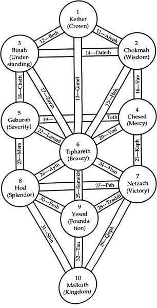 Каббала привнесла в магию несколько существенных компонентов. Самое главное – каббала создала в магии определенную структуру, образованную десятью сефирот – сферами, преломляющими божественную энергию для дальнейшего «использования». Эта структура известна как «Древо Жизни» (см. рис. 8). На эти сферы завязана масса симпатических аналогий, имен, планов, соответствий, что позволяет работать с соответствующими планами или энергиями. Можно сказать, что каббала внесла структурированное эзотерическое понимание мира, которое можно использовать в магических операциях [62].