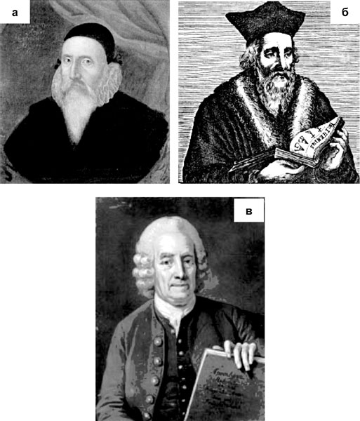 Рис. 9. Джон Ди (а); Эдвард Келли (б); Эммануил Сведенборг (в)