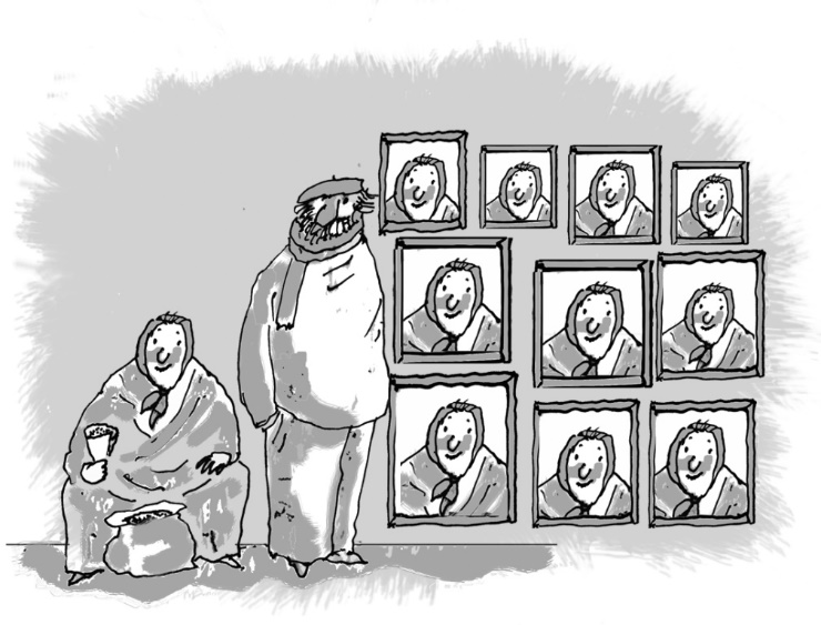 Вперёд от входа по центру – бабки с семечками. Торговок шесть в ряд. Щегловские кулацкие морды. Зимой – в тулупах, закутанные в плотные коричневые и серые шали. Летом – опять же в чём-то чёрном и замотанные в кокон платков. На земле стоят большие холщовые кули-мешки с жареными и сушёными семечками, за ними на скамеечках сидят необъятные торговки. Одна из них негромко зазывает покупателей: