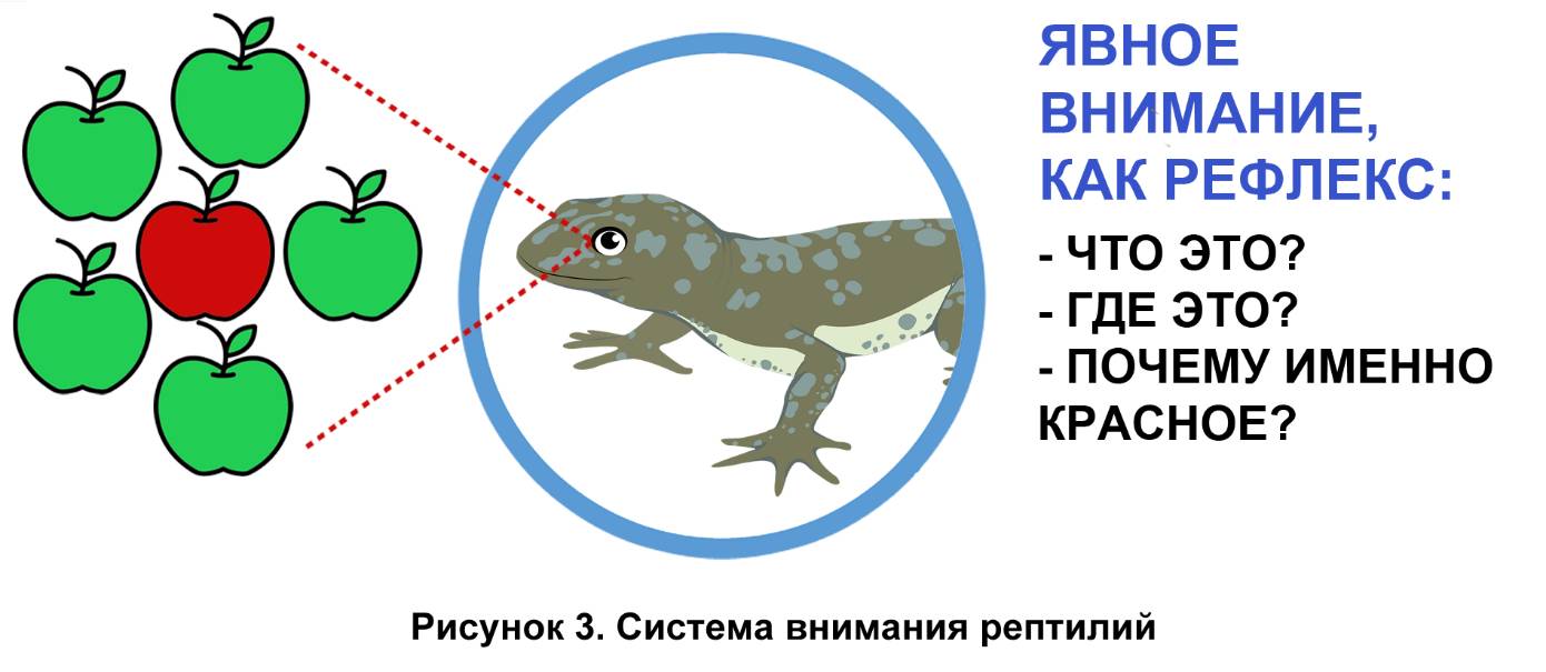 Факт в том, что у рептилий появился общий командный центр, где обрабатывалась вся сенсорная информация. А как мы называем реакцию на любой внешний стимул? Правильно – рефлекс. Рептильный мозг руководит явным вниманием и явное внимания является рефлексом. Этим рефлекторным вниманием человек не способен управлять (рисунок 3).