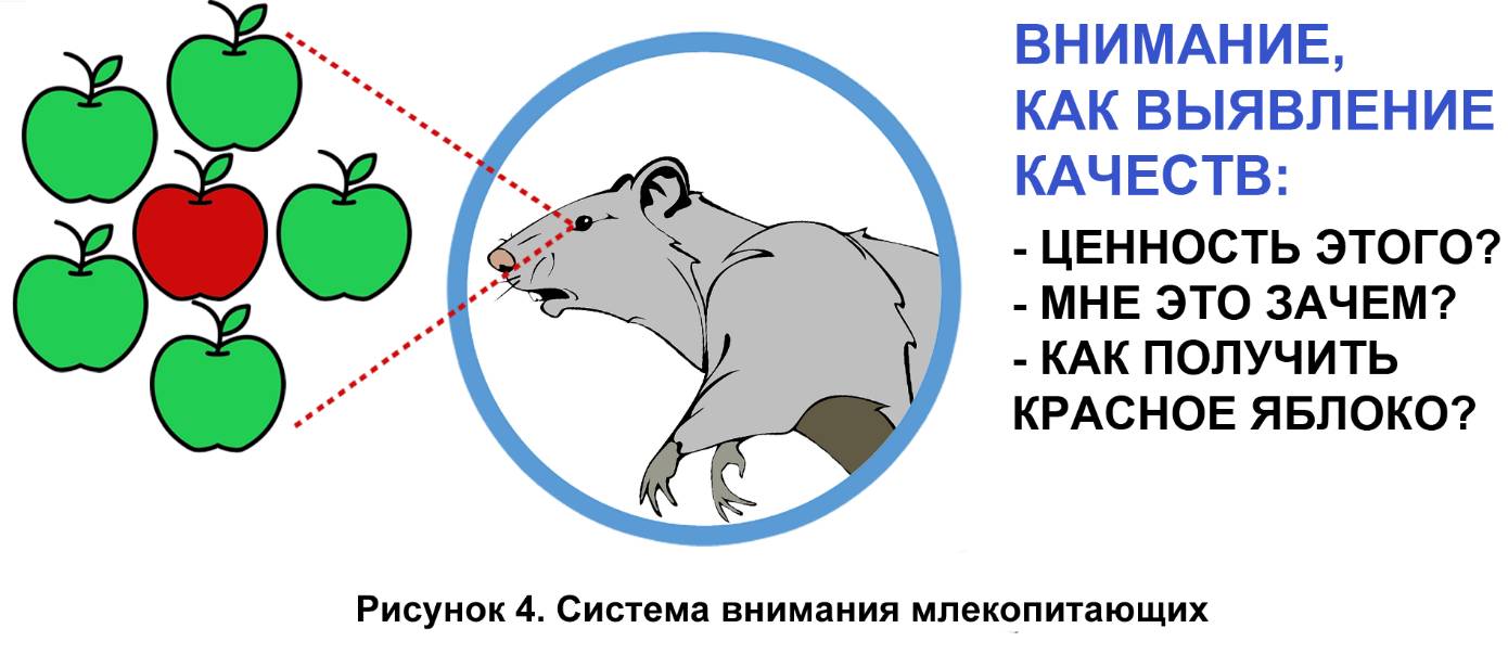 Млекопитающие начали создавать интеллектуальные объекты (разной сложности) на своей внутренней сцене. Это еще нельзя назвать сознанием, но они уже научились приспосабливаться, лучше охотиться и учиться на своих ошибках. И да, стоит сказать, что любое млекопитающее – эгоцентричное существо и им движут только инстинкты (рисунок 4).
