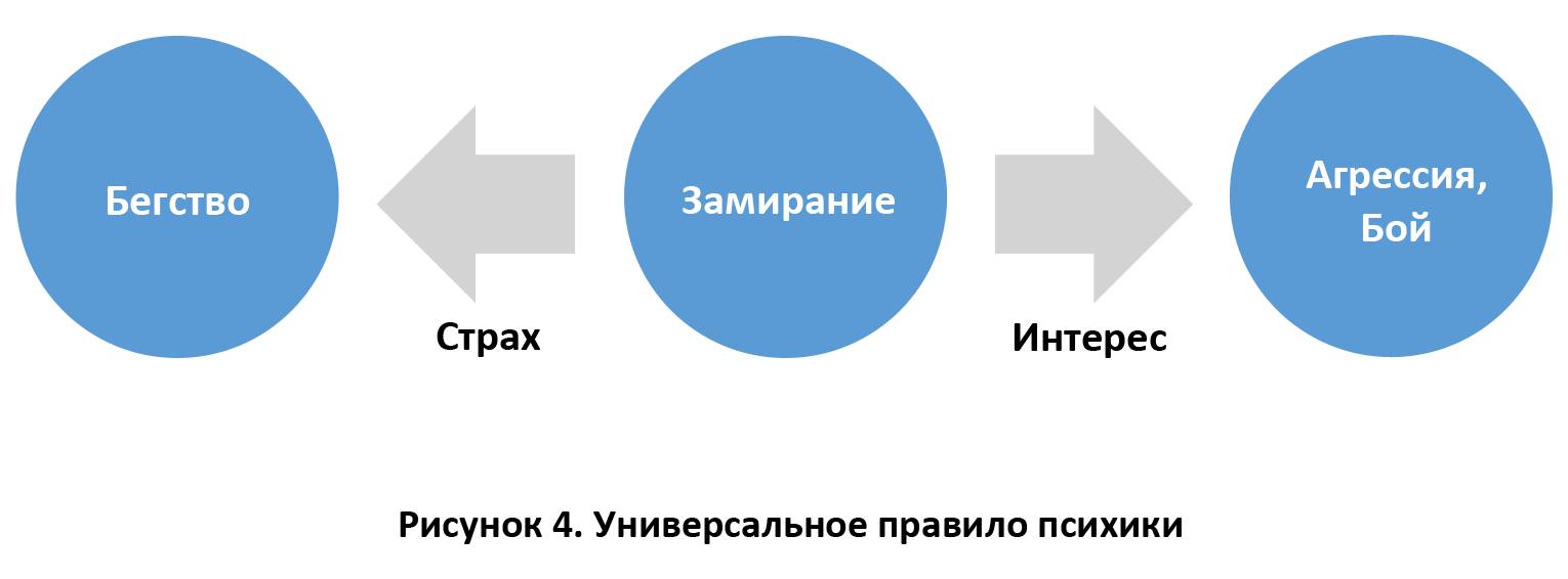 Рептилия в нас и животных далеко не всегда проявляет агрессию или убегает (Рисунок 4). Зебра, антилопа, любое создание (которое питается травой) на первый шорох в кустах как реагирует? Животное встаёт как вкопанное, это совершенно другой паттерн поведения. Единственное, что стоит добавить в эту схему, – «Замирание». Оно не всегда заметно, да и у человека его сложно вычислить из-за сложности и вариантов поведение, но без него картина не полная.