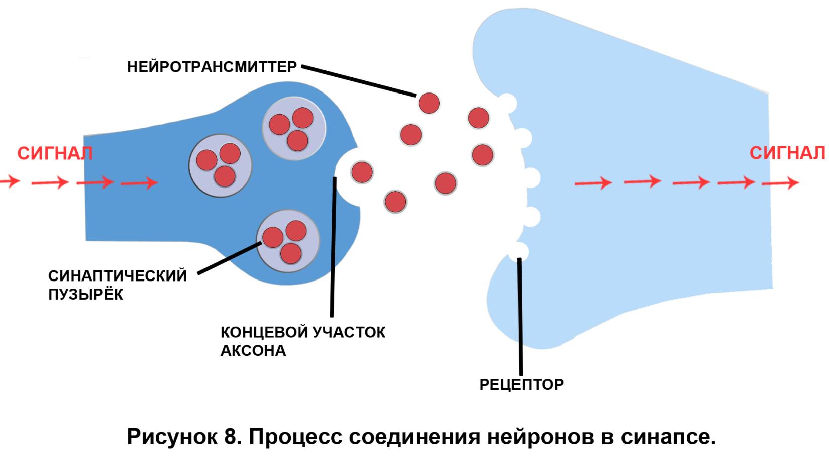 Связь между нейронами представляет из себя нечто материальное. Сигнал в мозге – это нечто электрическое. Не клеится пока? По природе электрический сигнал проходит через нейрон, концевые участки аксона (через который нейрон передаёт сигнал) выделяет «пузырьки», в которых находятся нейротрансмиттеры. Не пугайтесь новым названиям, нейронтрансмиттеры – это просто гормоны или прочие активные вещества, которые помогают нейронам установить физический контакт81. Сигнал, если помните мы говорили, перепрыгивает между нейронами (Рисунок 8).