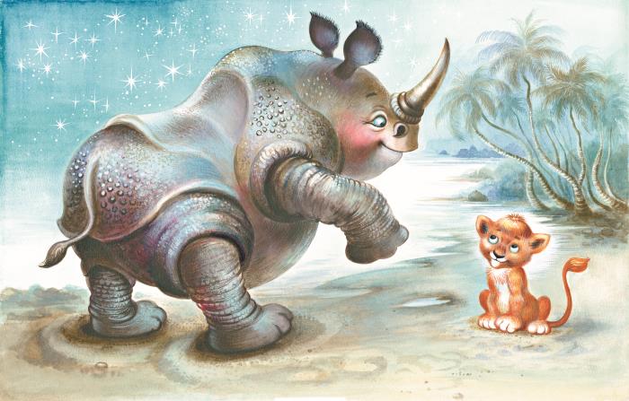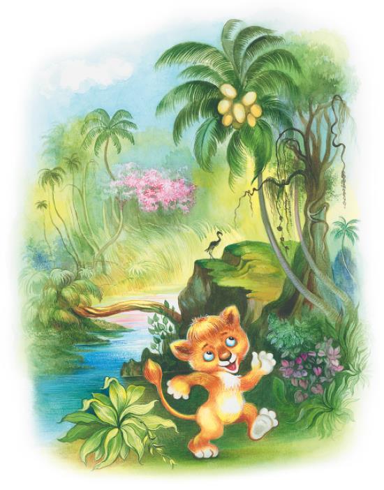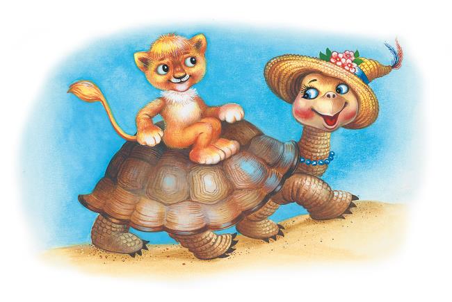 Носорог-рог-рог идёт,Крокодил-дил-дил плывёт, —пела Черепаха, —Только я всё лежуИ на солнышко гляжу!Львёнок подкрался совсем близко, лёг на песок рядом с Черепахой и приподнял одно ухо, чтобы лучше слышать.