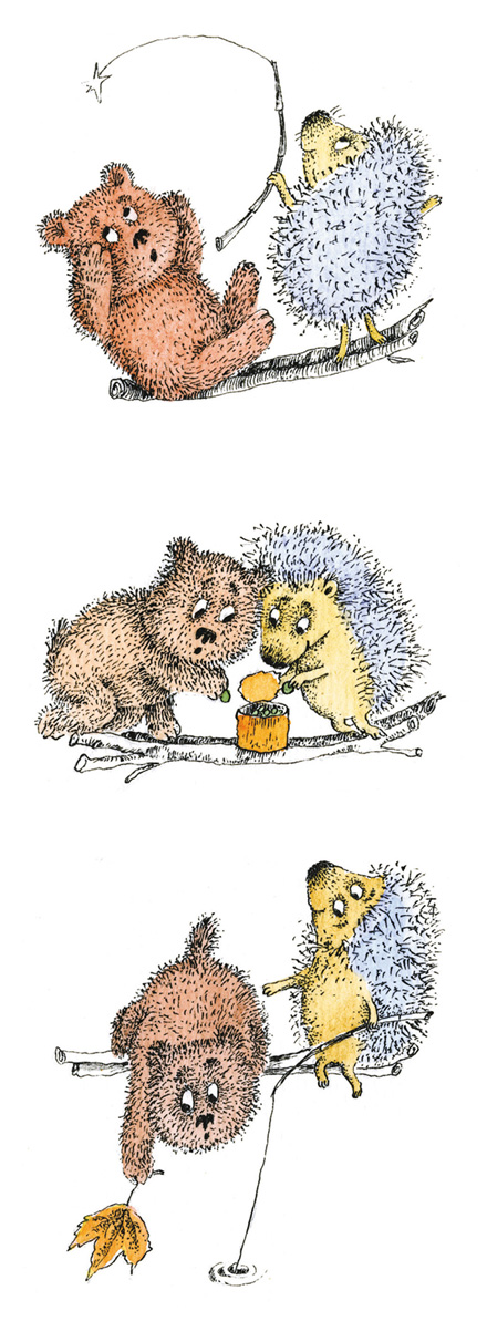 Они сидели на узеньком берёзовом мостке и смотрели в воду. Медвежонок смотрел на поплавок Ёжика, а Ёжик – на поплавок Медвежонка. Было тихо-тихо, и поплавки неподвижно отражались в воде…