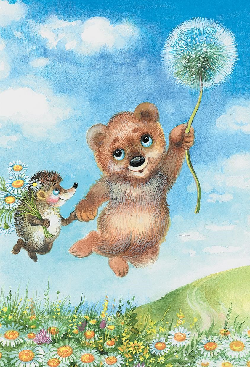 Но тут дунул ветер. Одуванчик Медвежонка вмиг облетел, и Медвежонок кубарем полетел вниз.