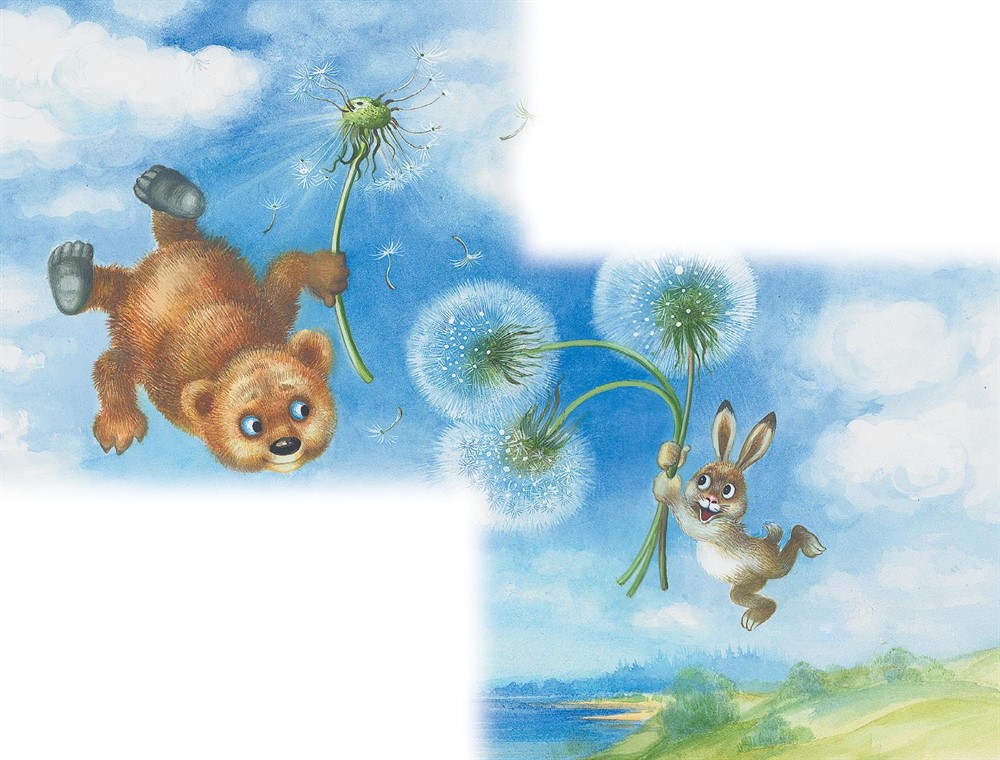 – Да погоди ты со своим Зайцем! – буркнул Медвежонок, сорвал одуванчик и… и тут же оторвался от земли. И поплыл на одуванчике, как на воздушном шаре.