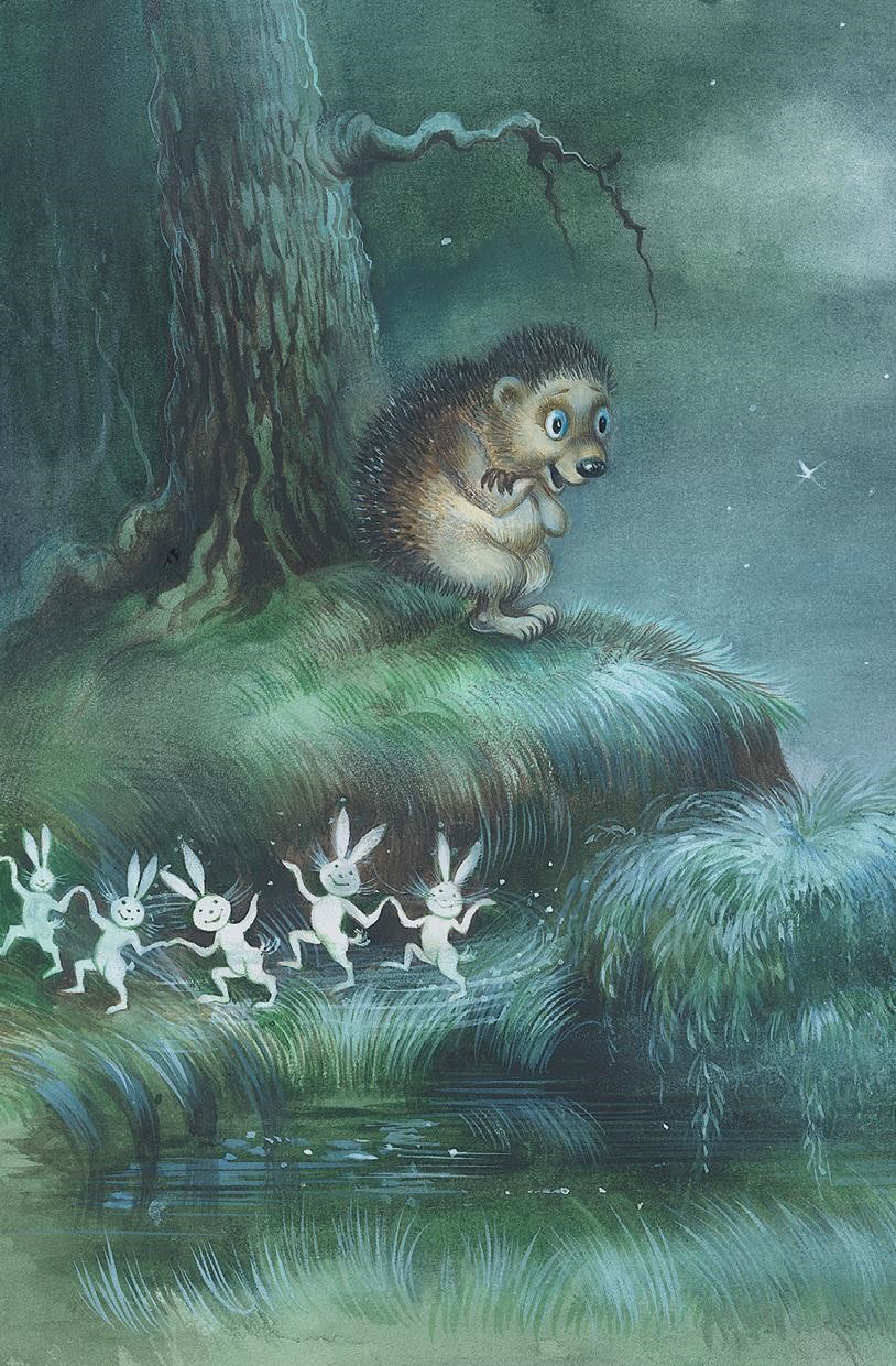 Ёжик сидел на горке под сосной и смотрел на освещённую лунным светом долину, затопленную туманом.