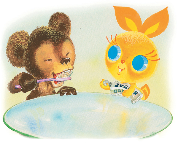 И тогда Медвежонок почистил зубы своей зубной щёткой, а Солнечный Заяц – лапой, хотя это не по правилам и у каждого должна быть своя зубная щётка, но что же делать, если Солнечный Заяц в это утро так спешил к Медвежонку, что оставил свою зубную щётку дома?