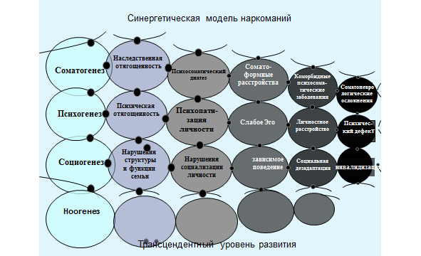 В нашей клинике помимо био-психо-социо-духовной модели развития болезни стали внедряться такие концепции как синергетическая модель и экзистенциальная модель зависимостей (рис.1). Синергетический подход можно представить 4 основными плоскостями (векторами) био-психо-социо-духовной модели: соматогенезом, психогенезом, социогенезом и ноогенезом (духовным развитием). Соматогенез предполагает развитие систем и функций организма; психогенез – развитие психических функций, социогенез – развитие социальных ролей и отношений, ноогенез – динамику развития личности в духовной сфере и включает в себя Я-концепцию, 4 базовые экзистенциальные мотивации, систему ценностей индивидуума, экзистенциальную фрустрацию и т. д.