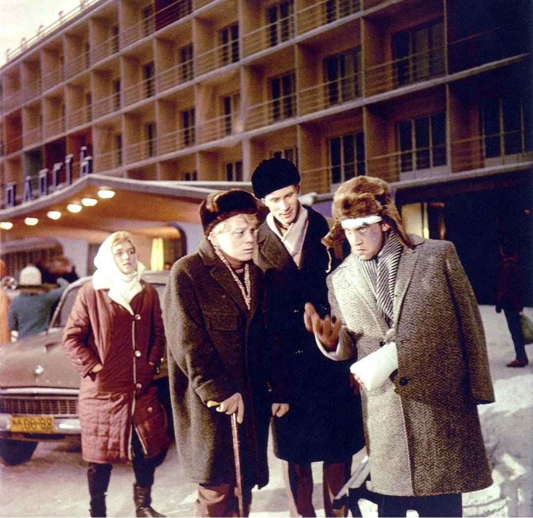 Часть сюжета картины проходила в гостиничных номерах, для съёмок в которых были построены павильоны на Киностудии им. М. Горького. С общим планом самой гостиницы решили не заморачиваться и снимали актёров и постояльцев в одном лице прямо по месту их временного проживания. На фото слева на право актёры: Лилиана Алёшникова, Игорь Пушкарёв, Владимир Гудков, Владимир Высоцкий. Источник – первая и последняя киноафиша В. Высоцкого, которая будет напечатана в Казахстане в 1964 году, в ходе его первых в жизни неформальных гастролей.