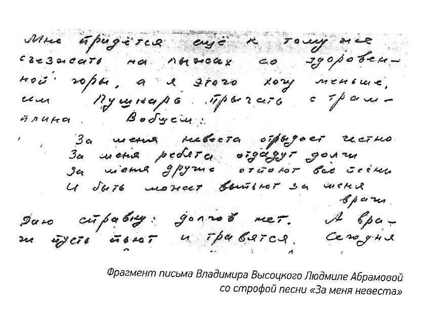 Пребывание Владимира Высоцкого в Алма-Ате в 1963 году можно условно озаглавить как «Роман в письмах с Людмилой Абрамовой». Ещё в советское время было опубликовано шесть писем, написанных зимой, со съёмок кинокомедии «Штрафной удар», и три майских письма того же года, во время подготовки к съёмкам фильма «По газонам не ходить».