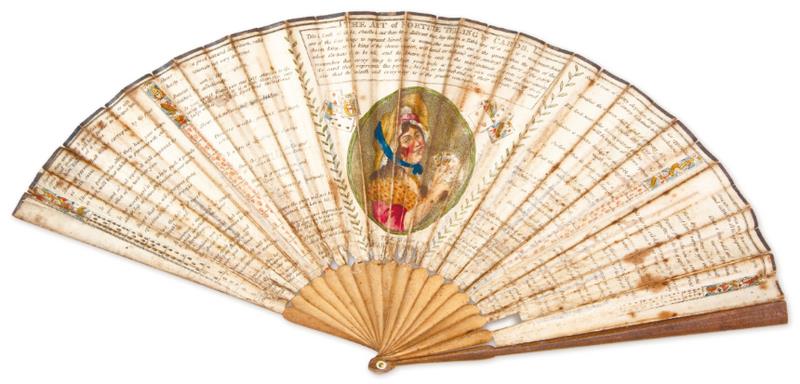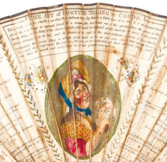 Она открыла свой шкаф с коллекцией вееров, осторожно достала и развернула старинный английский веер, на котором были нарисованы гадальные карты, а рядом с ними слова пророчеств. В центре веера, над овальным изображением гадалки с картами, была надпись, она гласила: «Искусство предсказания по картам».