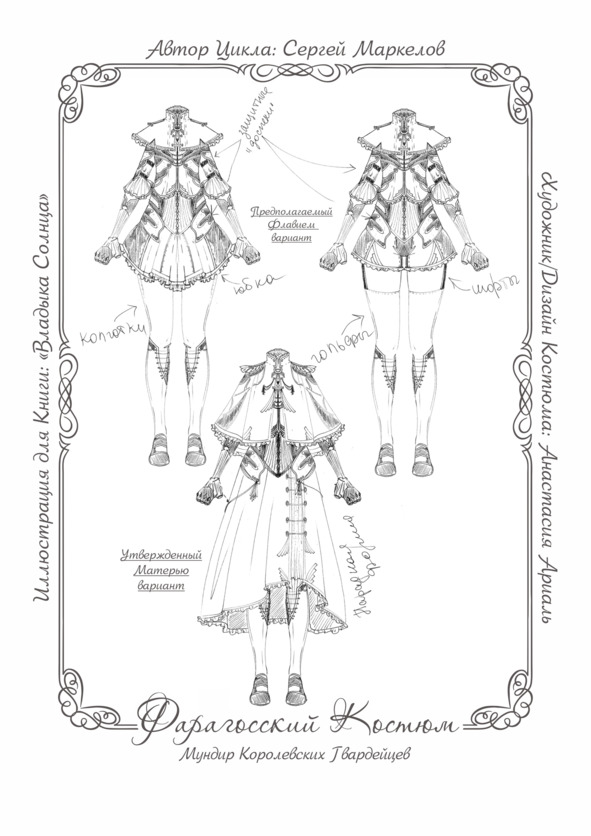Чуть завышенный уровень талии подчеркивал тканный корсет с шнуровкой по бокам. Как того и требовали Законы Фарагосии, ножки девушек были прикрыты штанишками, на подобии тех, что носили более рослые представительницы Королевского Флота. Тканные сапожки до колен, что крепились на шнурках, и перчатки без пальчиков отлично дополняли Костюм.