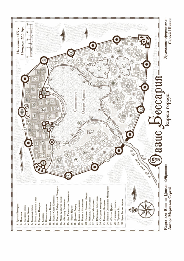 Некогда эта крепость была основана, как последний аванпост перед рубежами Врага. А ныне Оазис стал Священным местом поклонения Богине Арима, в Честь которой назвали Озеро. Из него берет начало единственная во всей Бессарии судоходная река Сира, впадающая на западе в Океан Грез.
