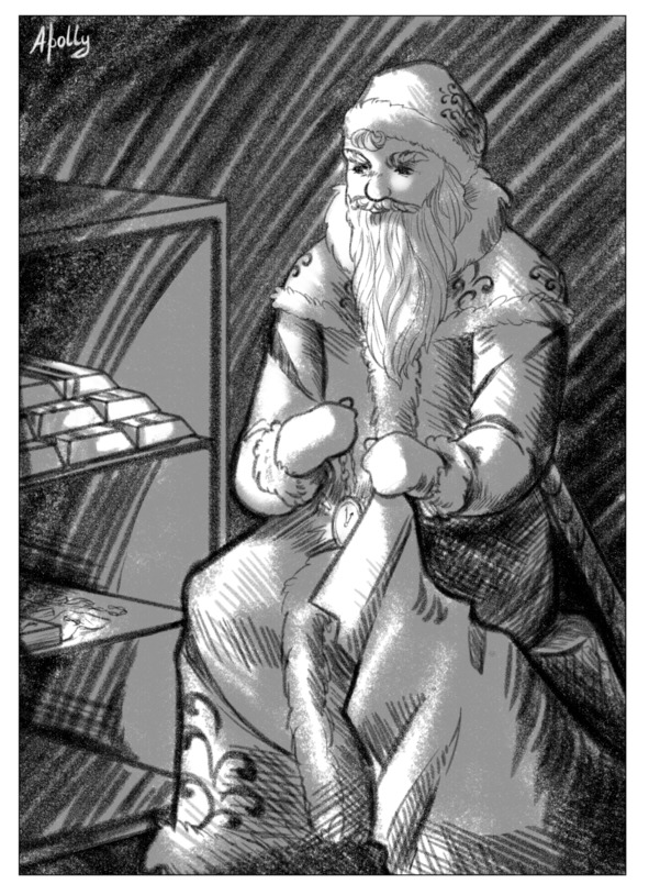 Добыча быстро оказалась в заплечном мешке Деда. Злоумышленники прикрыли сейф и быстро направились к выходу из особняка. Забрались в сани, которые поднялись вертикально вверх метров на восемь, немного повисели в воздухе и полетели домой.