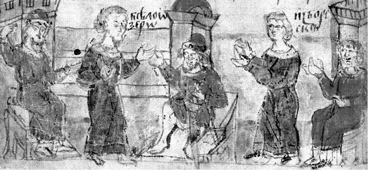 Рюрик, Трувор и Синеус. Миниатюра Радзивилловской летописи. XV в.