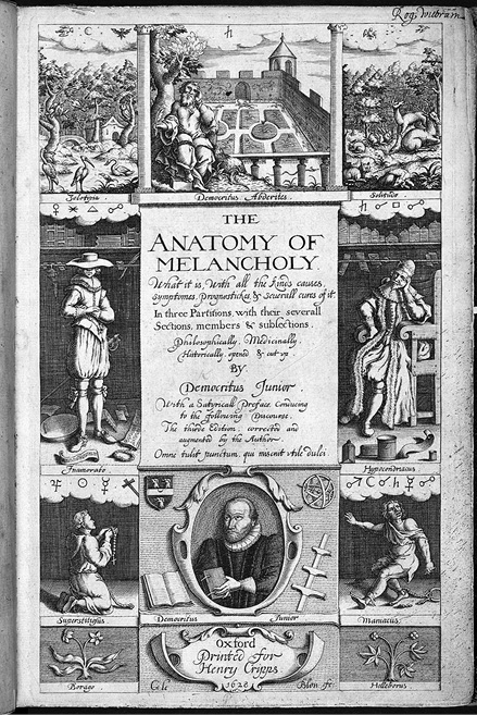 Титульный лист книги Роберта Бёртона «Анатомия меланхолии» (1628). Книга подписана псевдонимом Демокрит-младший, автор дополнял ее вплоть до смерти в 1640 году. Содержит множество отсылок, лирических отступлений и даже анекдотов и личных историй.