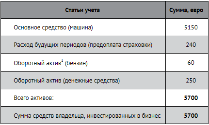 С точки зрения бухгалтерского учета вы приобрели основное средство (машину) за 5150 евро, потратили 60 евро на оборотный актив (бензин), а также произвели расход будущих периодов (оплатили полис) в сумме 240 евро. После чего у вас остался оборотный актив (деньги) в размере 250 евро. Результат произведенных операций можно представить в виде табл. 1-1.