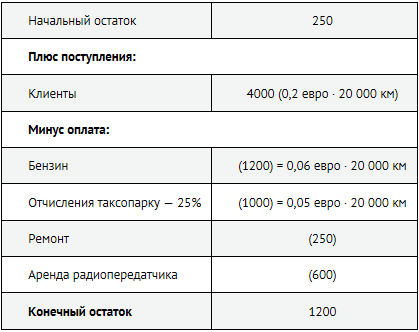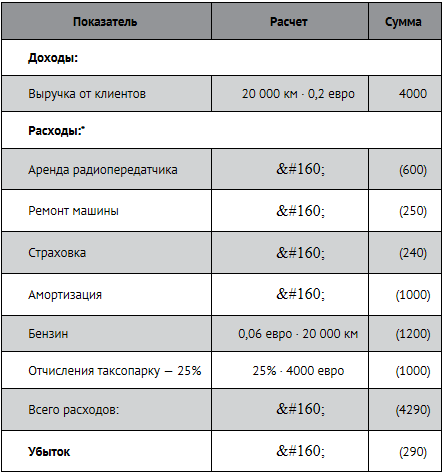 Допустим, что вы подписали контракт с частным таксопарком, по которому вы становитесь его работником за 25% от полученной вами выручки (определенной в размере 0,2 евро за 1 км). Кроме того, вы должны будете уплачивать 50 евро в месяц за аренду радиопередатчика, а также самостоятельно оплачивать расходы на ремонт и обслуживание автомобиля (примерно 250 евро в год).