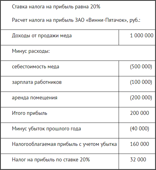 Пример 2.2Базовая схема расчета налога на прибыльЗАО «Винни-Пятачок» занимается продажей меда, который закупается на пасеках Алтайского края. Выручка от продажи меда в текущем году составила 1 000 000 руб. Себестоимость проданного меда – 500 000 руб.