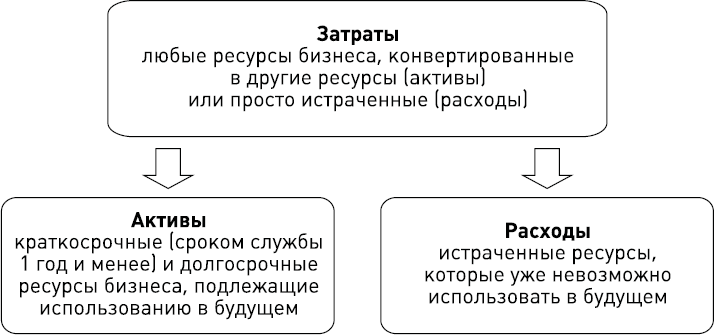 • на другие цели бизнеса, не приводящие к образованию активов (например, при оплате ремонта автомобиля или расходовании бензина уменьшается количество денежных средств и топлива, но другие активы не возникают). Этот вид затрат называется расходами.