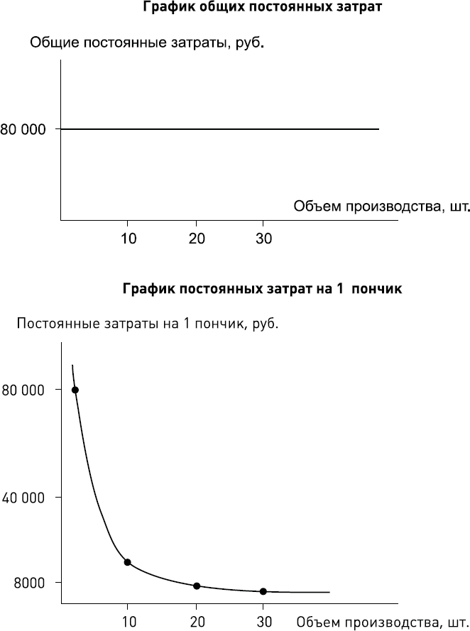 Например, если общий объем производства равен одному пончику, как общие, так и средние постоянные затраты на один пончик составляют 80 000 руб. Если произведено два пончика, то общие постоянные затраты остаются неизменными (80 000 руб.), а средние постоянные затраты на один пончик уменьшаются вдвое (40 000 руб.). При изготовлении десяти пончиков средние постоянные затраты на один пончик становятся равными 8000 руб., а при изготовлении 1000 пончиков – 80 руб. на один пончик.
