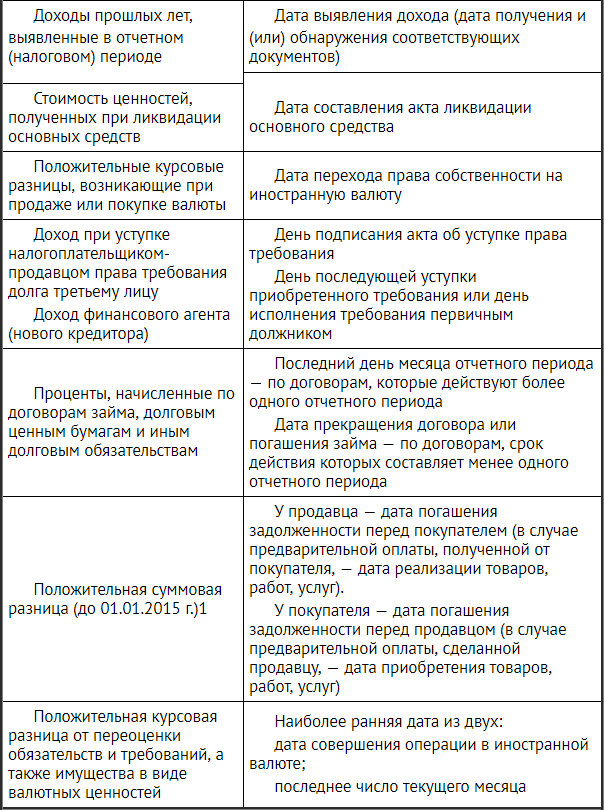 Положительные курсовые разницыНалоговый учет на территории Российской Федерации ведется в рублях. Поэтому требования и обязательства, выраженные в иностранной валюте, а также имущество в виде валютных ценностей должны пересчитываться в рубли на более раннюю из указанных ниже дат: