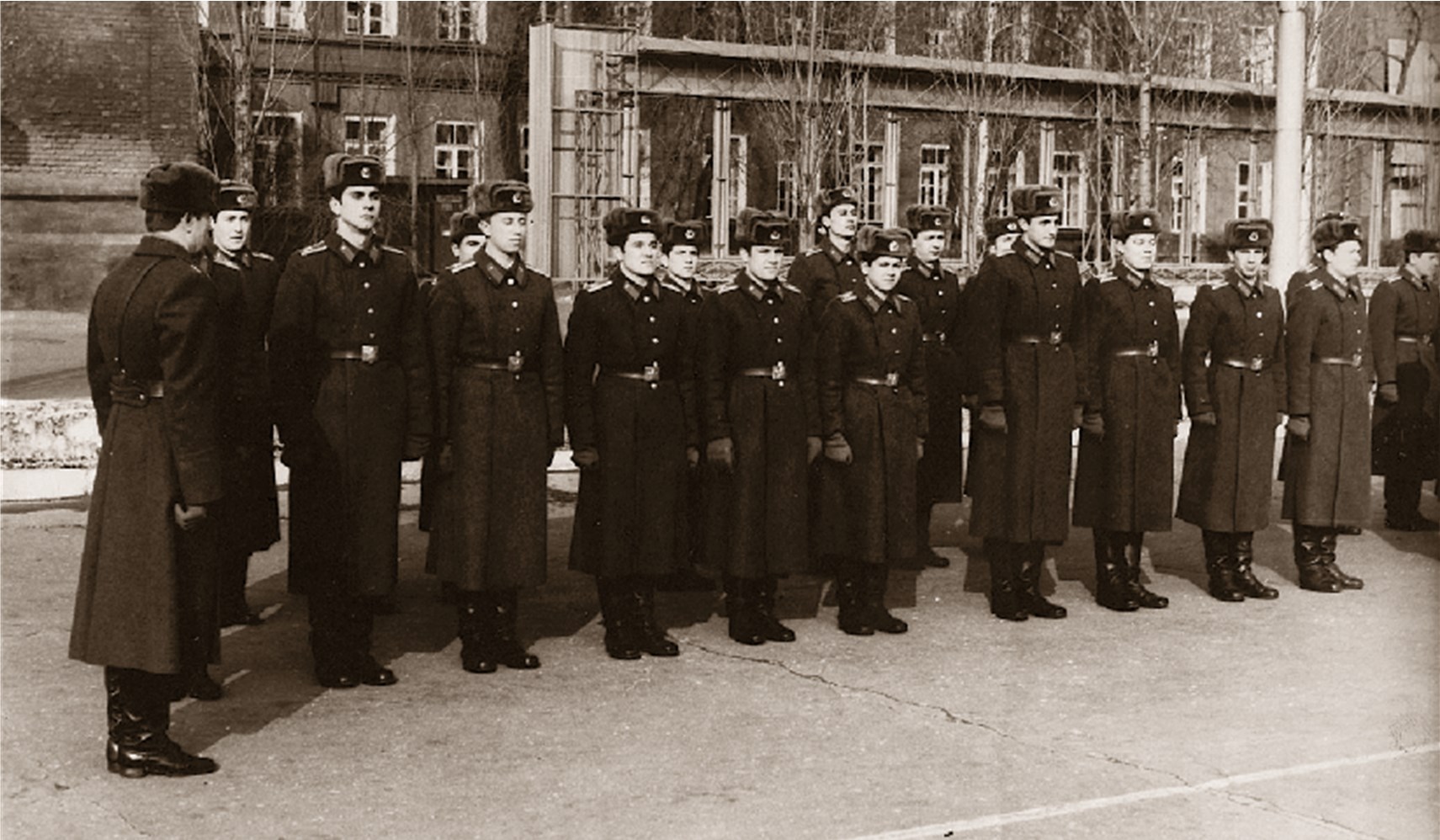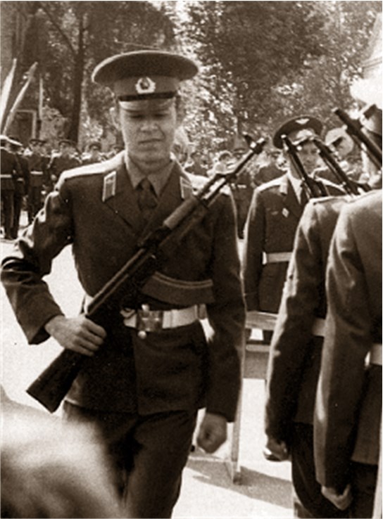 Утром под звуки духового училищного оркестра маршируем на плацу. Затем под лучами палящего светила стоим, пока высокопоставленное начальство произносит речи, поздравления. В итоге один из курсантов нашей группы получает солнечный удар, и его незаметно уносят головой вперёд.
