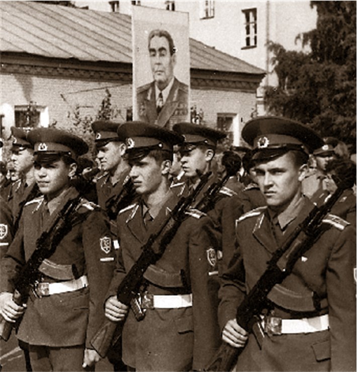 Стою во втором ряду, без очков, под портретом Брежнева, а в первом ряду: Евгений Тепляков, Роман Резниченко и Олег Аганин