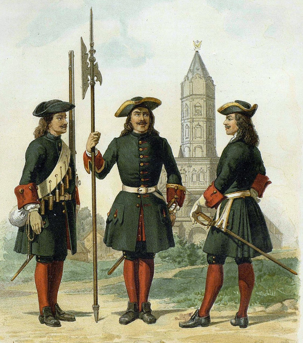 Армия Петра I: рядовой, сержант с алебардой, офицер, Преображенского полка