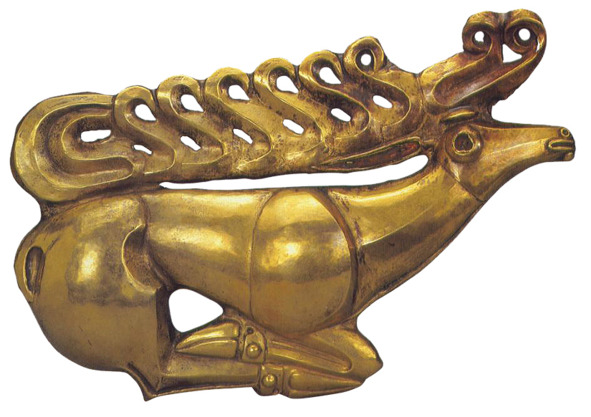 Золотая пластина на щит воина в виде лежащего оленя. Была найдена в Костромском кургане в Краснодарском крае. Датируется VI веком до нашей эры, представляет собой образец раннескифского звериного стиля. Хранится в Эрмитаже