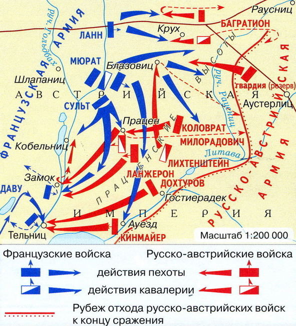 Наполеон лично руководил сражением, которое началось примерно в 7 часов утра 20 ноября (2 декабря) 1805 года наступлением русско-австрийских войск. Обходящие колонны генерал-лейтенантов Дохтурова, Ланжерона и Пржибышевского, развернутые в две линии, под общим командованием генерала Буксгевдена атаковали правый фланг французской армии. Четвертая колонна генералов Коловрата и Милорадовича выдвинулась на Праценские высоты. Пятая колонна генерала Лихтенштейна, австрийская кавалерия и авангард союзной армии под командованием генерал-лейтенанта Багратиона прикрыли правый фланг армии союзников. Русская гвардия расположилась за высотами.