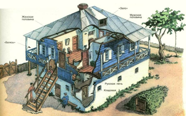 Жили казаки изначально в землянках, а потом стали строить деревянные и каменные дома, называвшиеся куренями. Казачий курень был, как правило, двух видов: типа южнорусской (украинской) хаты (распространён на Кубани) и двухэтажного типа (распространён у верхнедонских казаков). При этом последний тип назывался также «полукаменным», поскольку первый этаж – кирпичный, в основном – саманный, то есть из кирпича-сырца51, а второй – деревянный. Главный вход в курень – по крыльцу («порожкам») был устроен на второй этаж, окружённый особой террасой – «балясами». Главная комната (зала) была отгорожена от входной двери сенями. В красном углу этой комнаты (левом напротив входа) располагалась божница с иконами, под нею находился стол, накрытый чистой скатертью. Иконы в красном углу отождествлялись с алтарём православного храма, а стол – с церковным престолом. В божнице, кроме икон, казаки хранили сосуд с богоявленской водой, свечи, веточки освящённой вербы, пасхальные яйца, просвирки, записи молитв, поминальные книжки и прочее. Войдя в избу, казак сначала крестился на иконы в красном углу, а потом уже здоровался с хозяевами. В красном углу сажали самых почётных гостей. Вдоль стен располагались лавки. Все стены залы были увешены оружием (шашками, кинжалами и ружьями) и сбруей. Здесь же была печь, стоял «постав» (шкаф для размещения посуды со стеклянными дверцами). В центре залы обычно стоял обеденный стол. Убранство дополняли зеркало, сундук, кровать, стоявшая в углу, покрытая байковым или сшитым из лоскутков одеялом. Из залы дверь вела в спальню – на женскую половину, где стояла большая кровать, висела люлька для младенца, размещался сундук с вещами, прялка, швейная машинка «Зингер» и другое. Также из залы выходила дверь на мужскую половину, то есть комнату («гридница», «кунацкая», «молодецкая»), предназначенную для подростков или холостых казаков. При любом количестве комнат обязательно выделялась в самостоятельное помещение кухня («стряпная», «стряпка»), где готовили и ели пищу. В кухню выходила одной стороной и печь, размещённая в залу. Здесь она имела и чугунную плиту. На кухне располагались шкафы с посудой и припасами. Курени первоначально крылись соломой, чаканом, камышом, лубом или тёсом, а позже железом. Все подворья казаков были огорожены заборами, которые назывались «плетнями» – от слова плести. Их плели из лозы, которую заготавливали ранней весной. Также заборы могли быть и каменными – из ракушечника и песчаника.