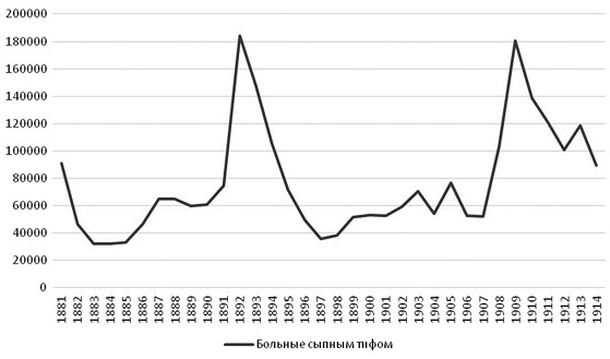 Преувеличение масштабов голода земскими служащими и либеральными кругами, равно как его недооценка госслужащими и консерваторами, нивелируются статистикой смертности и сопутствующих эпидемических заболеваний. Согласно исследованию Р. Роббинса, в пострадавших от неурожая губерниях в 1892 году сверхсмертность составила 406 тысяч человек54. В это число вошли умершие как от дистрофии, так и от эпидемий. Количество смертей от холеры в пострадавших районах Роббинс определил в 10 тысяч человек. Как известно, вспышки холеры неизбежно наблюдаются у голодающего населения, санитарное состояние которого невозможно признать удовлетворительным. Общеизвестна и непосредственная связь голода с сыпным, или «голодным», тифом. Динамика заболеваемости тифом коррелирует с ухудшением питания населения, а также с большими скоплениями обездоленных людей, ищущих работы. Уполномоченные Особого комитета отмечали, например, «серьезный характер тифозной эпидемии» в Пензе из-за скопления пришедших в город в поисках работы голодающих крестьян55. Эпидемии сыпного («голодного») тифа всегда сопровождали неурожаи. Так, в 1881 году, вслед за неурожаем 1880 года, в России вспыхнула эпидемия сыпного тифа, по размеру превзошедшая эпидемию военных лет (1877–1878)56. Однако самая большая вспышка сыпного тифа началась после голодных 1891–1892 годов (в 1892 году было зарегистрировано 184 142 случая заболевания тифом и 604 406 случаев заболевания холерой57) и продолжалась до 1894 года. Следующая такая крупная вспышка эпидемии произошла вслед за неурожаем 1907–1908 годов и продолжалась до 1913 года.