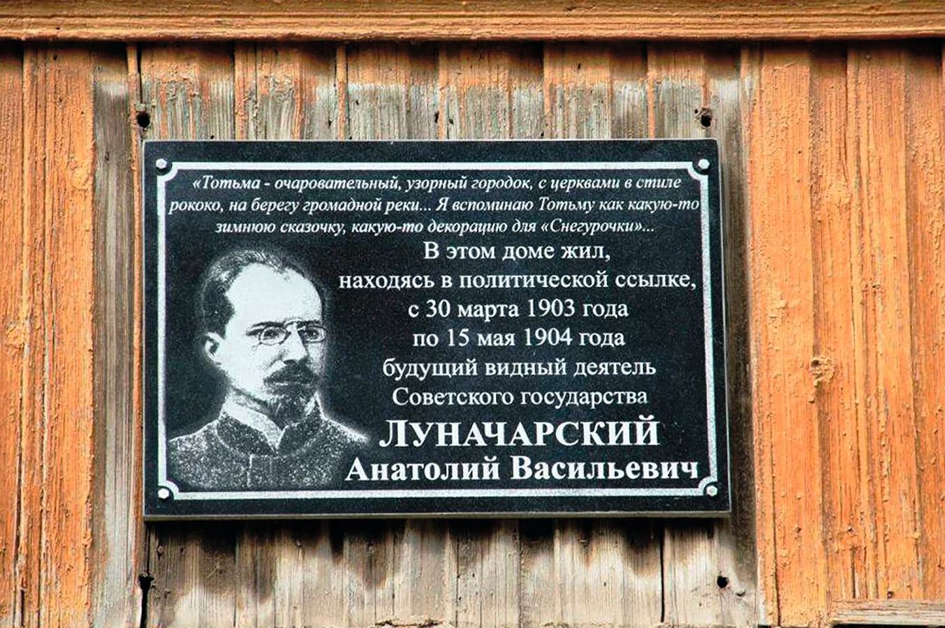 Памятная доска на доме в Тотьме, где жил в ссылке А. В. Луначарский.