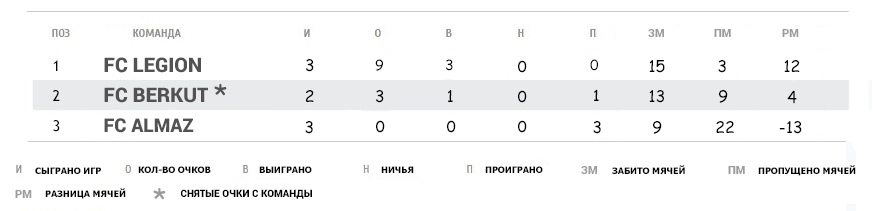 «Было рассмотрено дело по причастию судьи к договорному матчу от 26.09.2019 ФК Беркут – ФК Легион. ФК Беркут обыграл ФК Легион со счетом 8:7. Комиссия ПЛФЛ, перечитав протокол матча, признала, что матч ФК Беркут – ФК Легион, со стороны Футбольного Клуба Беркут, был договорным. В качестве наказания с команды ФК Беркут было снято 3 очка и было присуждено техническое поражение матча от 26.09.2019 со счетом 0:3.»
