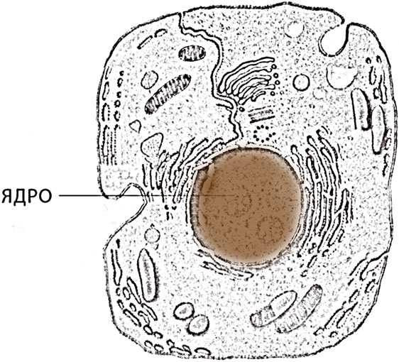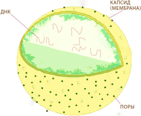 Как мы видим из рисунка, это совсем не похоже на вирус, но взгляните на ядро клетки, в котором находится ДНК. Давайте сравним его строение со строением вируса.
