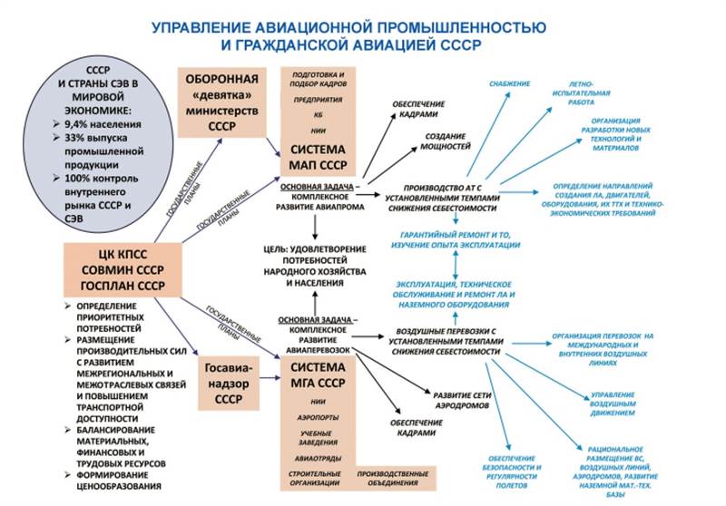 Согласно утверждённым Советом Министров СССР положений, Министерство авиационной промышленности СССР (МАП СССР)14 и Министерство гражданской авиации СССР (МГА СССР)15 имели единую цель, формулировка которой в положениях обоих министерств совпадала дословно (!): «удовлетворение потребностей народного хозяйства и населения» посредством соответственно комплексного развития авиационной промышленности и комплексного развития авиаперевозок (рисунок 1.5).